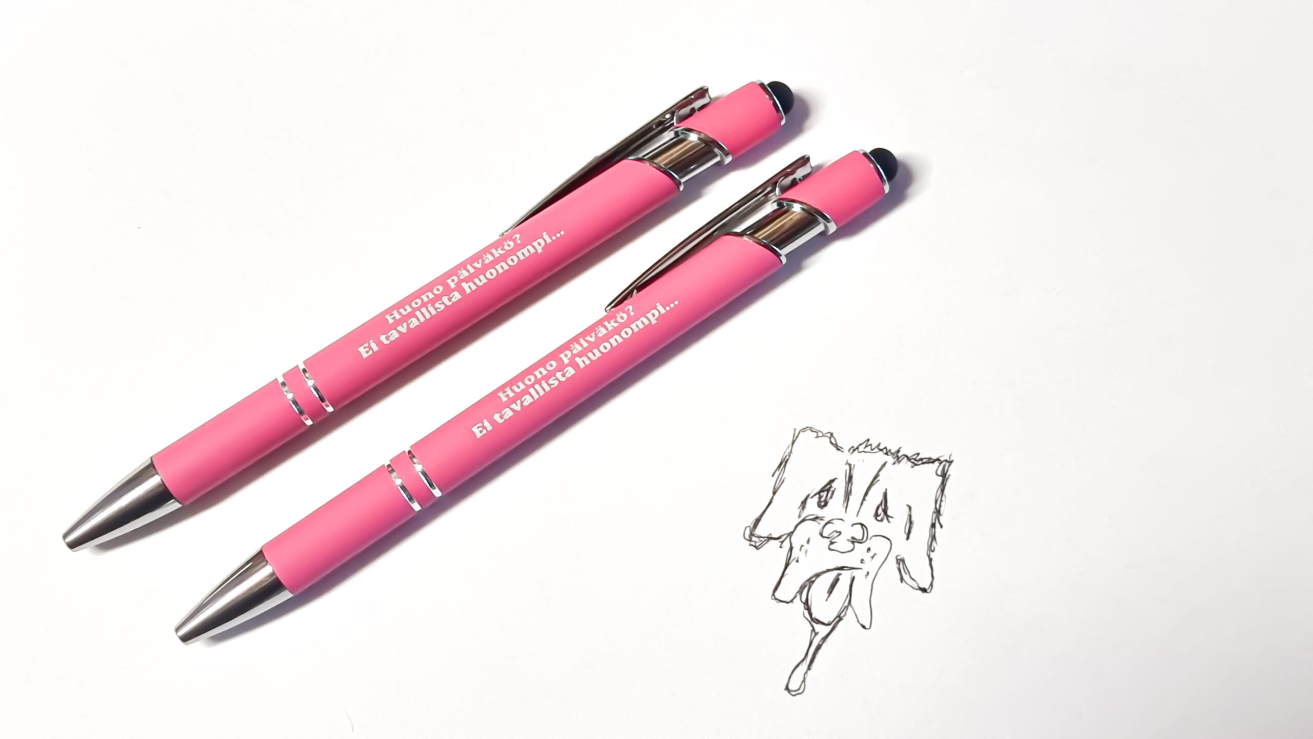 Ellen omalla sloganilla varustettu kynä – Huonopäiväkö? Ei tavallista huonompi.